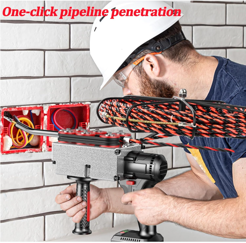 Speed up wiring jobs with a cordless automatic wire puller designed for wall conduits and junction boxes, delivering up to 40 m/min feed/retract speed to run cables quickly through long or complex pipes. The flexible, spring‑loaded lead head improves cornering through bends, while the grippy drive wheels and high‑torque brushless motor provide strong traction for reliable pulling in electrical renovation or new installations. Includes a 15 m lead wire, charger, and a single 20V Li‑ion battery (approx. 4.0Ah class) compatible with the machine for cordless convenience on site.