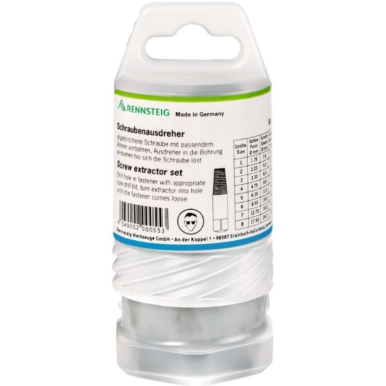 The extractor set is engineered to recover seized or sheared fasteners without damaging the parent thread. Each tapered, spiral extractor is manufactured from hardened Cr‑V steel for strength and wear resistance and features a zinc‑phosphate surface to reduce corrosion. The assortment spans eight sizes to tackle jobs from small M3 screws to large M45 studs, making it a versatile kit for workshops, maintenance teams, and field service technicians. Designed exclusively for right‑hand threads, the set is packaged in a durable plastic tube for portability and quick selection on site.