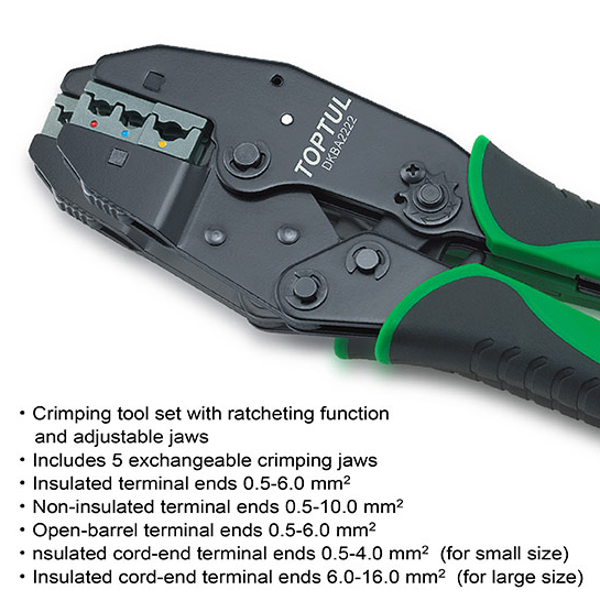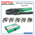 TOPTUL GAAI0605 crimping tool kit, ratchet crimping tool, quick interchangeable crimper, wire crimping set, insulated terminal crimper, non-insulated crimping tool, open-barrel crimper, professional electrician tools, DIY wiring kit, alloy steel crimping jaws.