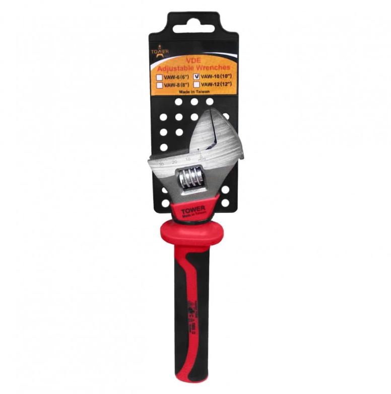Tower Tools VDE Insulated Adjustable Wrench (VAW6‑12) | 1000V EN/IEC 60900 | Chrome‑Vanadium | 6/8/10/12 inch.