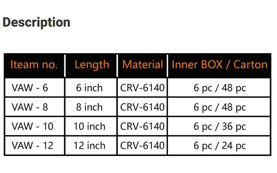 Offered by Tower Tools under model family VAW6‑12, the range covers the most‑used lengths, aligning with standard 6, 8, 10, and 12 inch VDE adjustable wrench options for broad on‑site coverage.