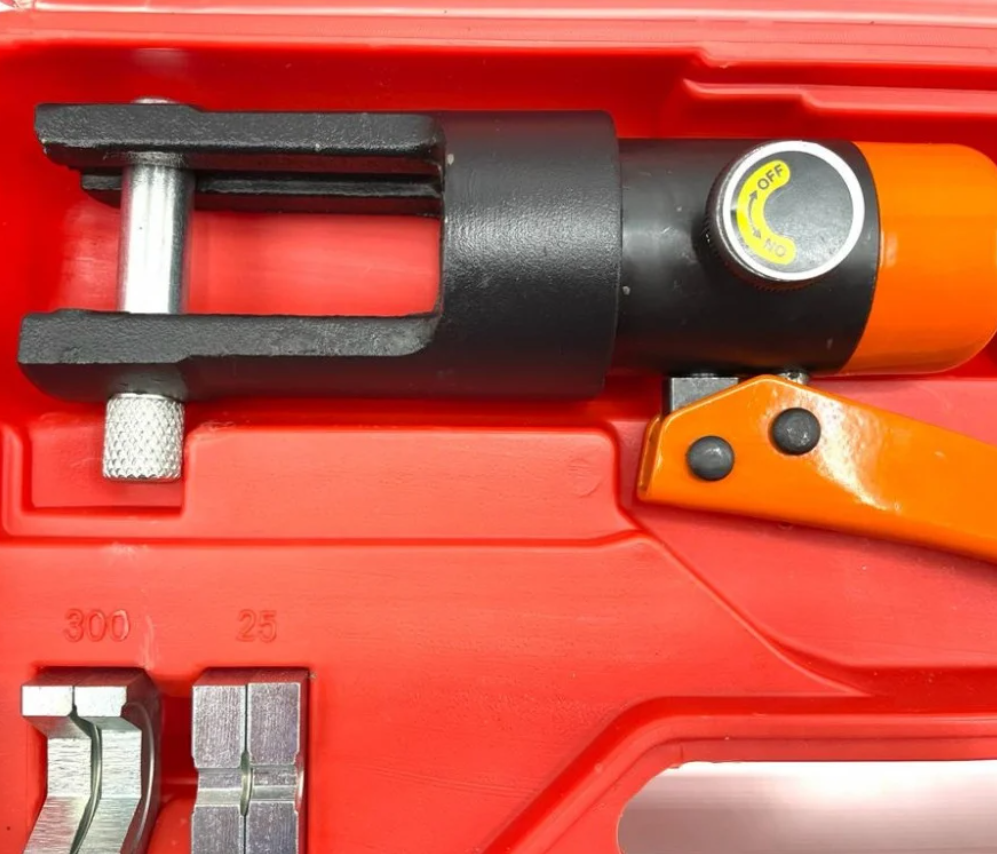The YQK-300 features a rotating crimper head (up to 180°), ergonomic, non-slip handles for extended comfort, and comes with a complete set of 11-13 hardened steel dies (16, 25, 35, 50, 70, 95, 120, 150, 185, 240, 300mm²) for versatile applications. The durable, chrome-finished dies provide long-lasting precision and rust resistance. An integrated safety valve ensures automatic pressure release when the max force is achieved. The set includes a heavy-duty carry case for organized storage and easy portability.